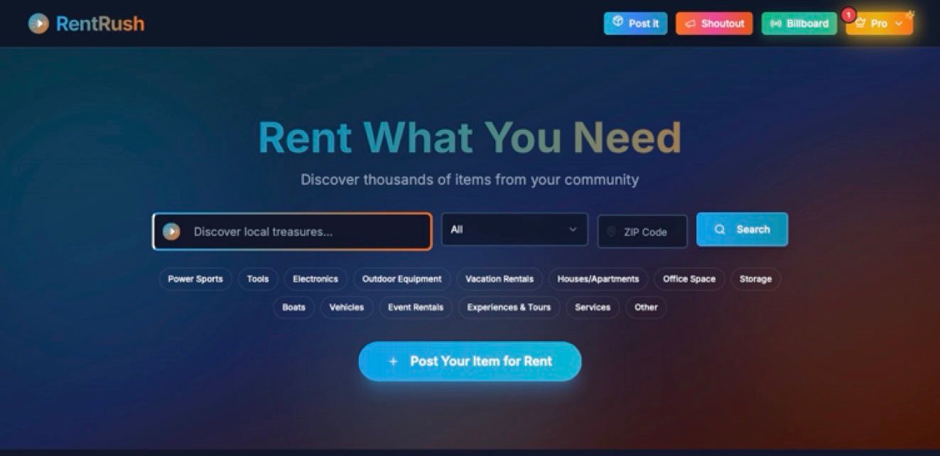 - Download RentRush on your phone and browse items available from neighbors in your area instead of calling big rental chains